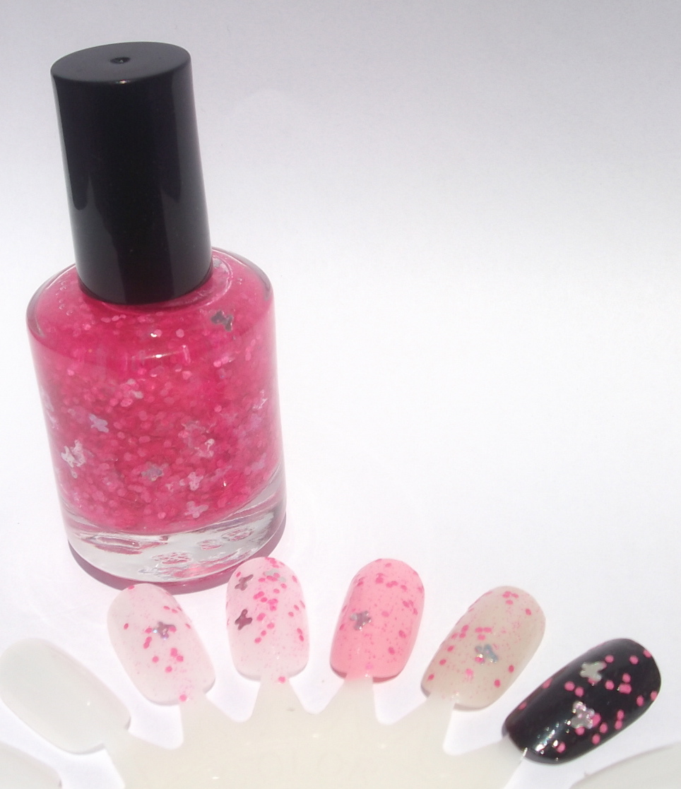 Notables: Vegas Skies (neon orange, purple and green glitter in a clear base) and Butterfly Kisses (pink hex and butterfly holographic glitter in a pink-ish base)